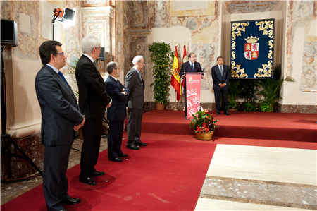El presidente de la Junta de Castilla y León, Juan Vicente Herrera, acompañado por el consejero de Educación, Juan José Mateos, y los rectores de las Universidades de Burgos, León, Salamanca y Valladolid, Alfonso Murillo, José Ángel Hermida, Daniel Ruipérez y Marcos Sacristán, respectivamente, ha presidido el acto oficial de toma de posesión de los presidentes de los Consejos Sociales de las citadas instituciones académicas.