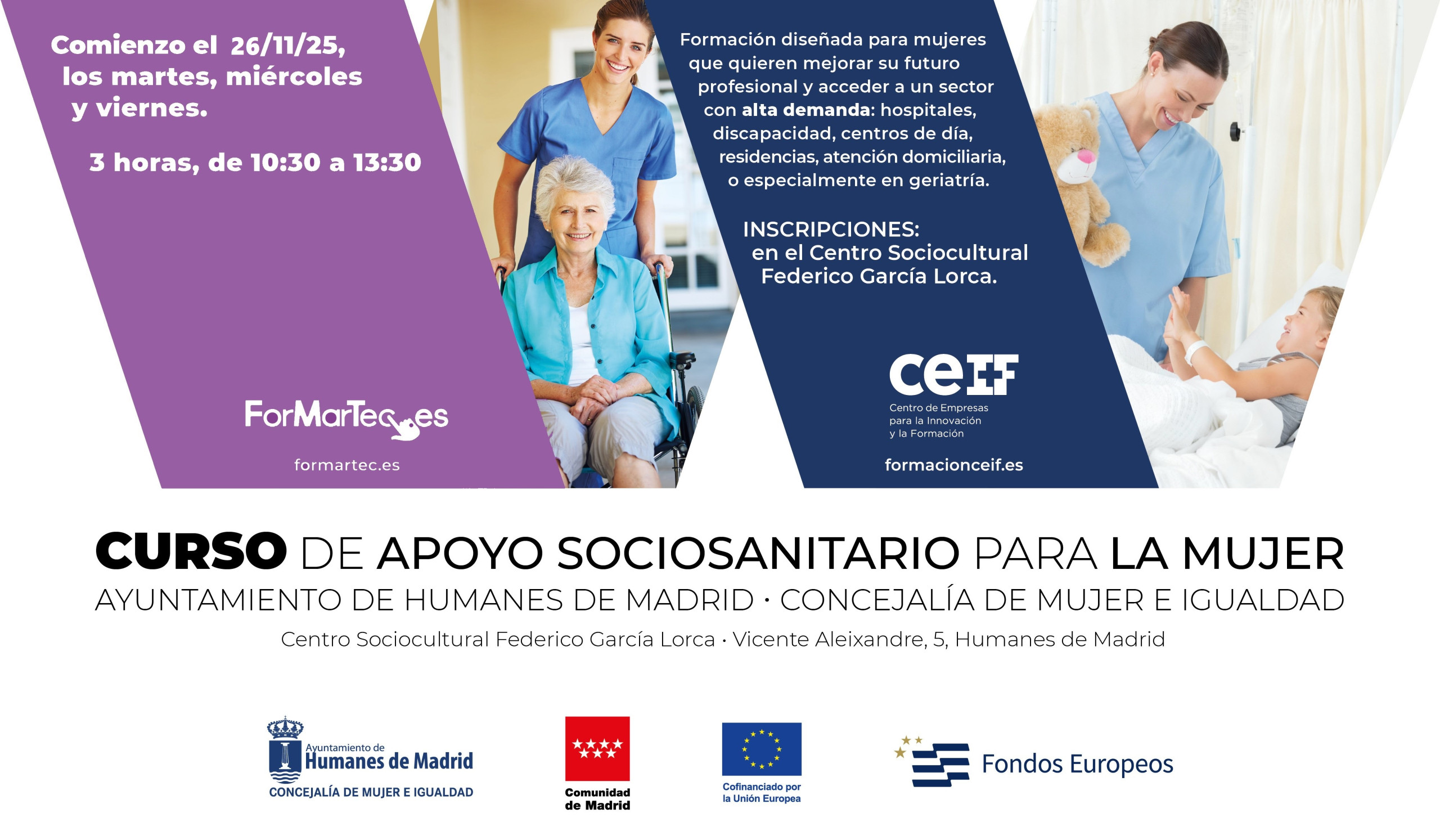 La Concejalía de Mujer e Igualdad del Ayuntamiento de humanes ha organizado un nuevo curso de Atención Sociosanitaria de 60 horas, impartido por CEIF–Campus Emprende Integral Formación.