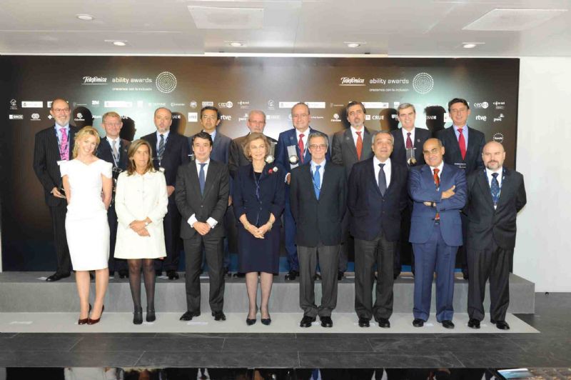 Su Majestad la Reina ha presidido el solemne acto de entrega de los Telefónica Ability Awards organizados por Telefónica para reconocer y valorar a las empresas y organismos que mejor integran la discapacidad en su modelo de negocio. En la mesa presidencial acompañaron a Dña. Sofía el presidente de Telefónica, César Alierta; la ministra de Sanidad y Política Social e Igualdad, Ana Mato; el presidente de la Comunidad de Madrid, Ignacio González; el secretario de Estado de Telecomunicaciones, Víctor Calvo-Sotelo; Luis Abril, secretario general técnico de la Presidencia de Telefónica y secretario del Jurado de los premios y la fundadora de estos, Caroline Casey.
