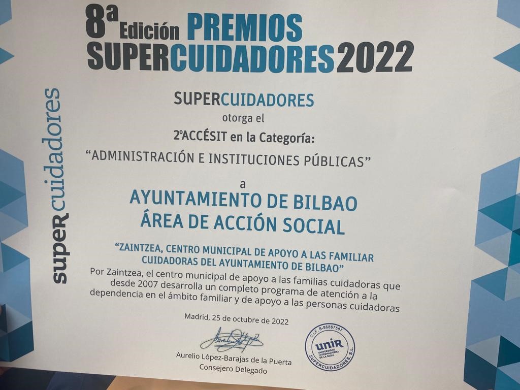 El Ayuntamiento de Bilbao caba de recibir el premio ‘Supercuidadores’ por el centro municipal de apoyo a familiares cuidadores, Zaintzea, en la octava edición de este certamen impulsado por la Universidad en Internet (UNIR).