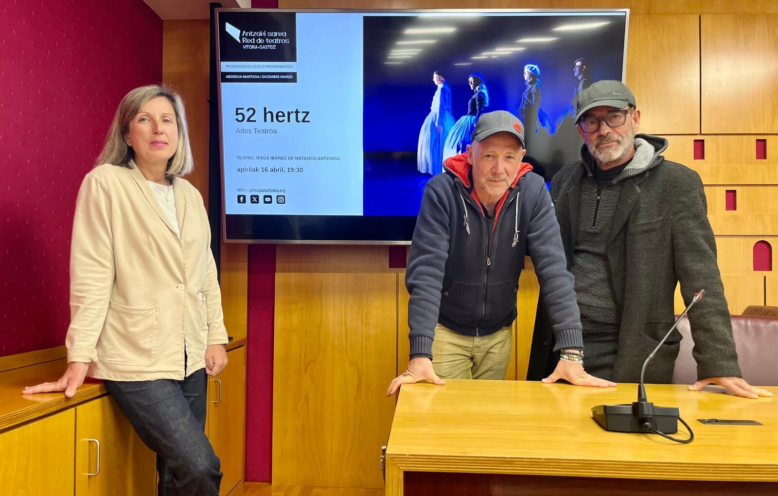 La actuación se lleva a cabo en el marco de la programación de primavera-verano de la Red Municipal de Teatros de la ciudad alavesa. El título 52 hertz hace referencia a la frecuencia de un sonido registrado en el Pacífico, similar al canto de una ballena azul. Sin embargo, estas ballenas se comunican en frecuencias que van de los 10 a los 39 hercios, por lo que la voz de este espécimen, vibrando a 52 hercios, queda fuera del umbral auditivo de las demás y ninguna otra puede escuchar su llamada.
