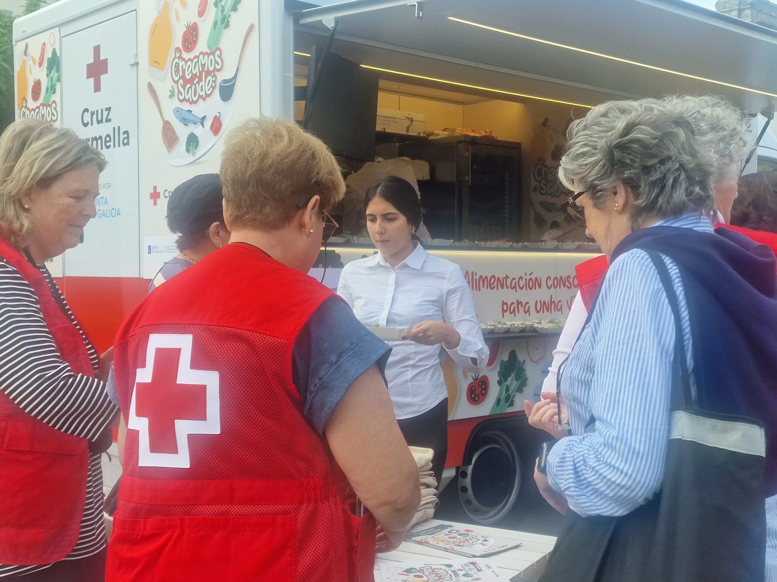 El objetivo de cada una de las sesiones ha sido ofrecer consejos, recetas y degustaciones fundamentados en las claves de una alimentación consciente y de su impacto en la salud. Por eso, a bordo de la food truck, profesionales y alumnado de las escuelas de hostelería CIFP Paseo das Pontes (A Coruña), IES Sanxillao (Lugo), CIFP Vilamarín (Ourense), CIFP Carlos Oroza (Pontevedra) y CIFP Manuel Antonio (Vigo) compartieron, junto al voluntariado y personal técnico de Cruz Roja, los principales detalles esenciales para poner en práctica una alimentación saludable desde los 65 años.