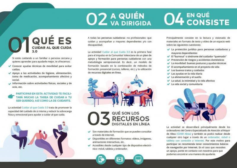 Cabe señalar que su primera fase, desarrollada durante este año y denominada 'Cuidar al que Cuida 3.0', consiste en la validación de los recursos de formación en línea a través de una prueba piloto en el Centro Especializado de Atención al Mayor (CEAM) de Altea, de titularidad municipal, gestionado y dirigido por la Fundación Salud y Comunidad y la Asociación de Asistencia Integral Lagunduz.