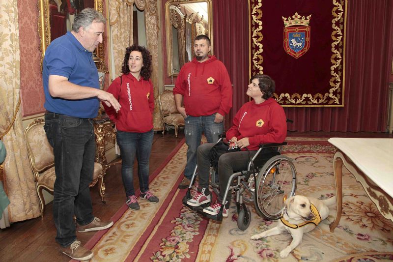 El alcalde de Pamplona, Joseba Asiron, recibió en la Casa Consistorial al presidente de la asociación Bocalán Biak Bat, Iosu Méndez, y varios profesionales e instructores, que han emprendido un proyecto que bajo el lema de "Conóceme, soy un perro de asistencia", pretende sensibilizar a la población sobre la labor de los perros de asistencia. Como parte de esta iniciativa, acudieron al Ayuntamiento para realizar un recorrido por la Casa Consistorial el propio Iosu Méndez, la coordinadora del proyecto y psicóloga, Josune Azpíroz, y la psicóloga e instructora de perros, Gara Maquirriain, que acudió además con su propio perro de asistencia.