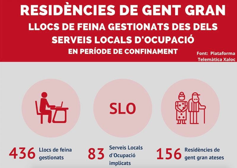 Desde el confinamiento, unos 80 servicios locales de empleo que forman parte de la XALOC han gestionado 436 nuevos puestos de trabajo a 156 residencias de mayores. De estos puestos de trabajo gestionados, más de la mitad pertenecían al sector sanitario, un 27,5% en atención a las personas y más de un 13% al de limpieza.