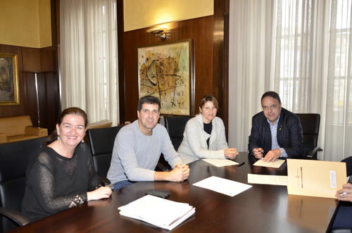 El alcalde de Manresa, Valentí Junyent, y los responsables de las empresas Servi3 Servicios a Domicilio SL, Servifamília sport a la Gent Gran, y Sant Andreu Salut (Eudald Redondo, Marina Manzano, Xavier Pubill y Alba Oms, respectivamente), han firmado una serie de convenios de colaboración para la prestación de servicios de proximidad a través del programa de ayudas sociales "Xec Servei".