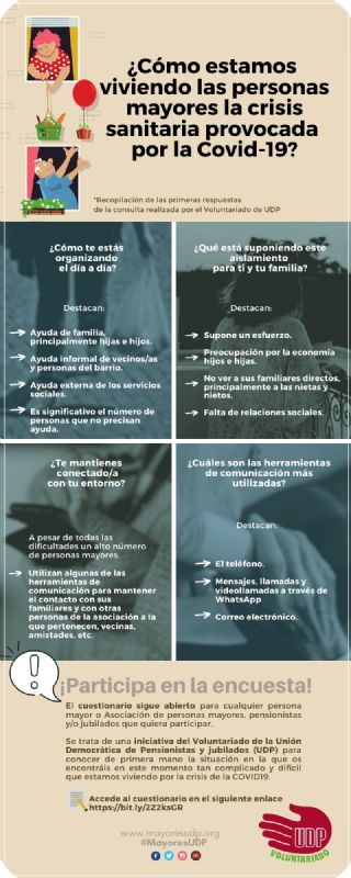 'Queremos saber cómo estáis' es una iniciativa promovida por el Voluntariado de la Unión Democrática de Pensionistas y Jubilados de España (UDP), para mantener el contacto con las asociaciones de UDP y las personas coordinadoras de los grupos de voluntariado, así como conocer de primera mano cómo están viviendo las personas que forman parte de la Unión Democrática de Pensionistas y Jubilados la crisis sanitaria causada por la Covid-19.