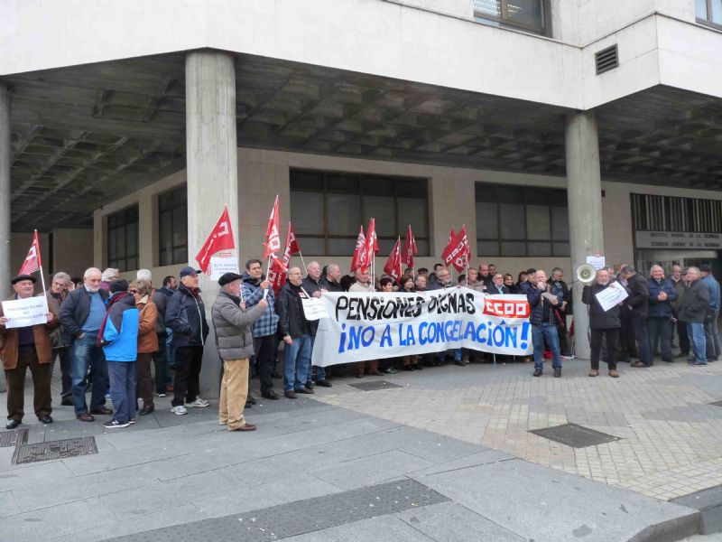 Un centenar de personas mayores se concentraron a mediados de febrero, convocados por la Federación de Pensionistas y Jubilados de CC OO de Navarra, frente a la Tesorería de la Seguridad Social (en la avda Conde Oliveto), con el objetivo de rechazar la congelación de las pensiones y exigir su revalorización. En la concentración se han oído lemas como ‘mas pensiones para las mujeres’, ‘manos arriba, esto es un atraco’ o ‘pensiones dignas, no a la congelación’. “Tras la ridícula subida del 0,25% por parte del Gobierno, las pensiones perdieron en 2016 un 1,35% del poder adquisitivo”, ha explicado Manuel Vázquez, secretario general de la Federación de Pensionistas y Jubilados del sindicato. Se confirman así los negativos efectos de la reforma del 2013, que ya advirtió CC OO de que llevaría a una pérdida cada vez mayor del poder adquisitivo de los mayores, como ya está sucediendo. No se trata de un problema de recursos, sino de cómo se redistribuyen los mismos. Además, la situación de crisis sigue provocando que muchos pensionistas estén pasando, cada vez más, a convertirse en sustentadores principales (en ocasiones, únicos) de los hogares. De hecho, en Navarra, cerca de 38.000 hogares dependen en exclusiva de los ingresos procedentes de las pensiones por jubilación. Una situación que se ve agravada por las continuas subidas de luz, gas, copago sanitario, etcétera. Unos ingredientes que están provocando un preocupante empeoramiento de las condiciones de vida de miles de pensionistas y sus familias.Por ello, ante esta grave situación, desde la Federación de Pensionistas y Jubilados de CC OO continuará luchando para exigir que se pongan en marcha cuanto antes las medidas necesarias para garantizar el poder adquisitivo de las pensiones y la sostenibilidad futura del sistema público.
