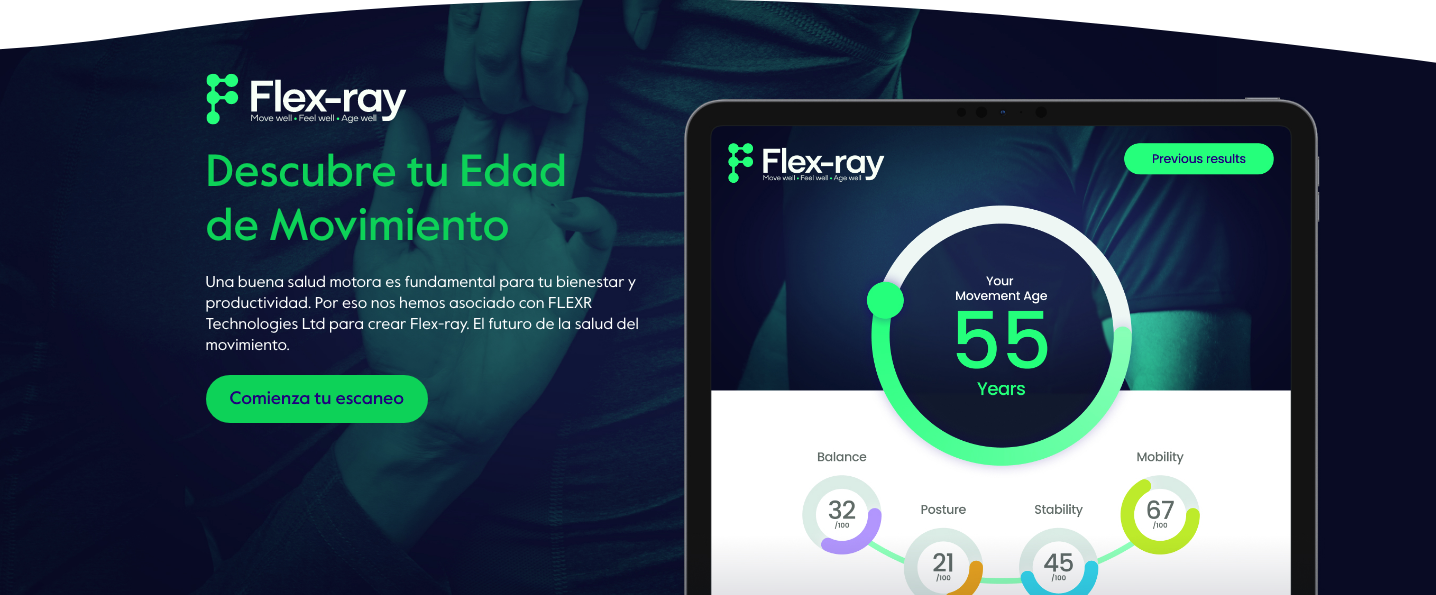 Al finalizar la evaluación, el usuario recibe su “edad de movimiento”, un indicador que compara su capacidad funcional actual con estándares óptimos definidos para cada grupo de edad, junto con un plan de ejercicios personalizado con niveles de dificultad progresiva, orientado a mejorar las funciones con menor rendimiento. Este valor permite identificar si el cuerpo se mueve de acuerdo con la edad cronológica o si existen señales tempranas de deterioro funcional. De hecho, más del 79% de las personas que han utilizado Flex-ray presentan una edad de movimiento superior a su edad real, lo que muestra cómo el sedentarismo y las largas jornadas laborales pueden afectar la salud musculoesquelética.