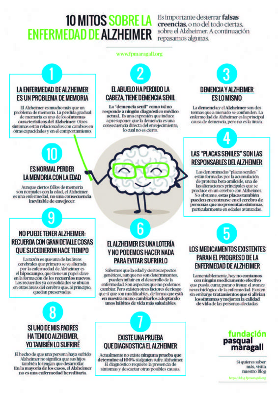 La Fundación Pasqual Maragall ha elaborado una infografía con diez mitos sobre el Alzheimer y sus respectivas realidades, sobre las que profundizan en su blog
